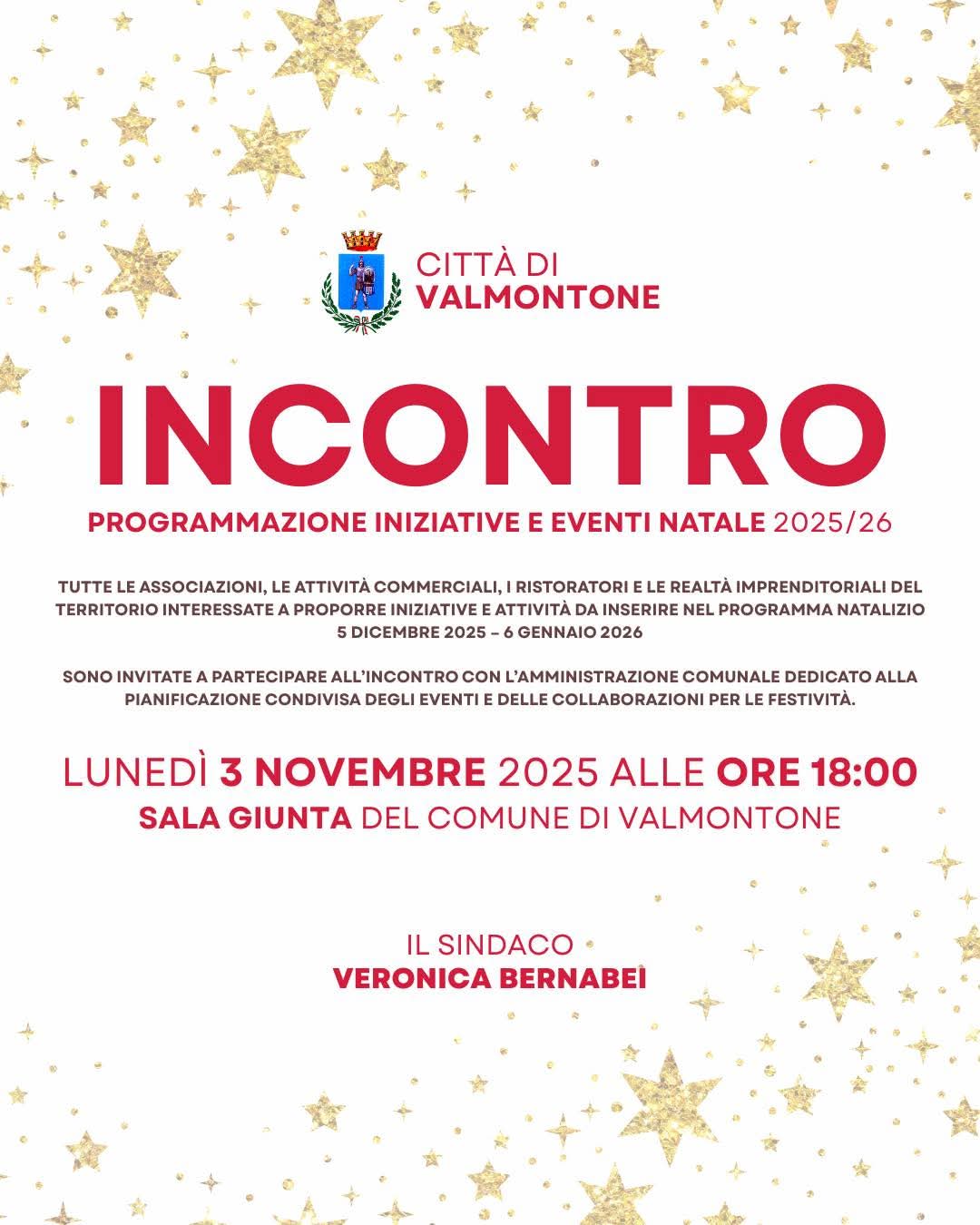 Si informa la cittadinanza di Valmontone che, in vista delle Festività Natalizie 205/2026, l’Amministrazione comunale è lieta di invitare associazioni, attività commerciali, ristoratori e imprese ad un incontro dedicato all’organizzazione delle iniziative che animeranno l’agenda dal prossimo 5 dicembre al 6 gennaio 2026.