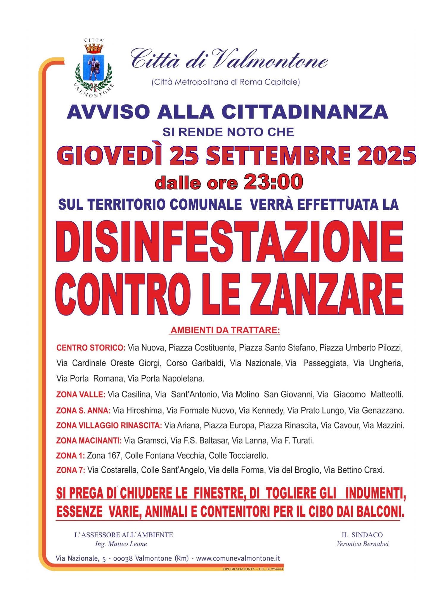 Si informa la cittadinanza di Valmontone che, giovedì 25 settembre 2025, a partire dalle ore 23:00, è in programma un intervento di disinfestazione contro le zanzare sul territorio comunale.