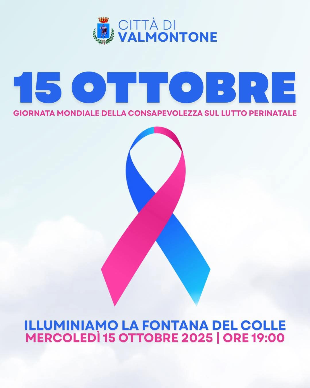 A Valmontone, mercoledì 15 ottobre 2025, alle ore 19, la Fontana del Colle si illumina di rosa e di azzurro: un segno di partecipazione e vicinanza verso tutte le famiglie che hanno conosciuto il dolore della perdita di un bambino, durante la gravidanza o subito dopo la nascita.