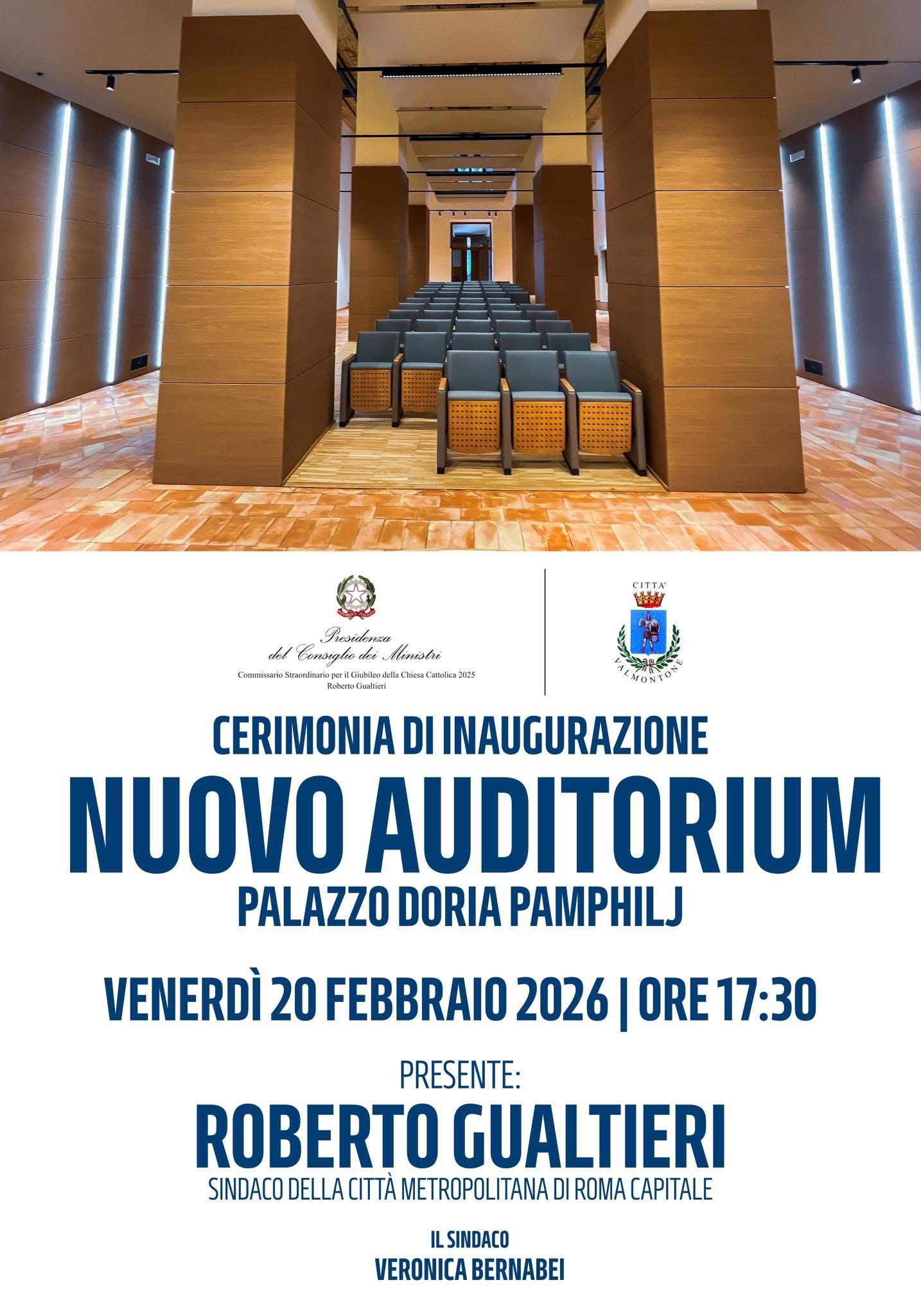 Venerdì 20 febbraio, alle ore 17.30, il Sindaco della Città Metropolitana di Roma Capitale Roberto Gualtieri e il Sindaco di Valmontone Veronica Bernabei, inaugureranno il nuovo Auditorium di Palazzo Doria Pamphilj.