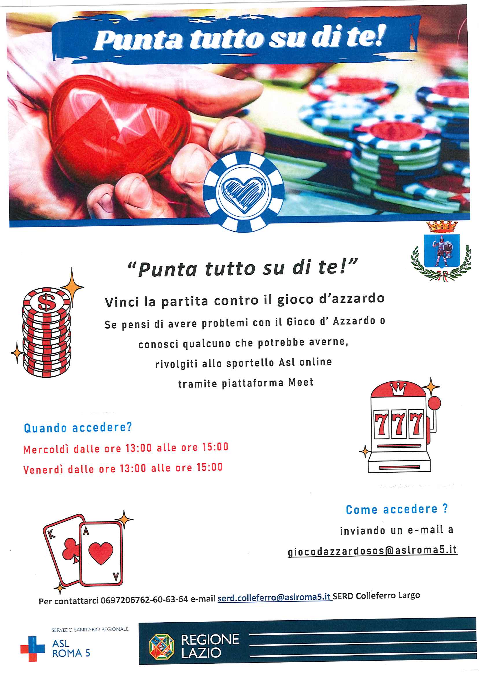 La ASL RM5 mette a disposizione uno sportello di ascolto rivolto a chi affronta problematiche legate al gioco d’azzardo, offrendo un servizio di supporto e orientamento. È possibile accedervi online tramite la piattaforma Meet, nei giorni di mercoledì e venerdì dalle ore 13:00 alle ore 15:00, così da garantire uno spazio riservato di confronto e aiuto.