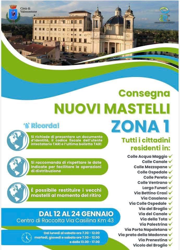 Si informa la cittadinanza di Valmontone che, lunedì 12 gennaio 2026 (come da programma), prende il via la consegna dei nuovi mastelli per la Raccolta Differenziata.